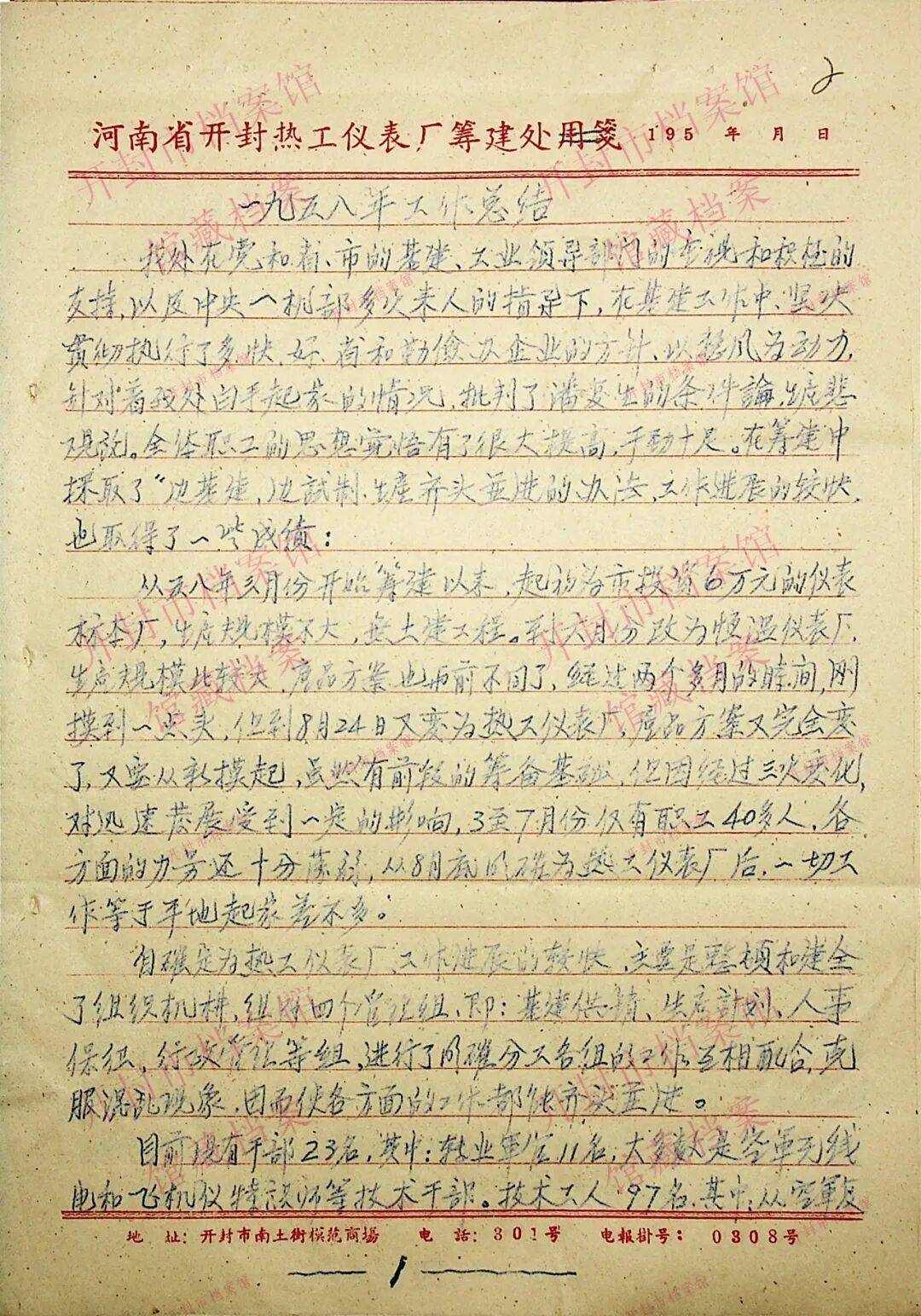 开封仪表厂是1958年中央确定的重点建设项目,关于其早期发展历经的3次更名有不同的记载。据《开封仪表有限公司志》记载,初为“开封仪表制造厂”,后依次更名为“开封仪表标本厂”“开封热工仪表厂”。但据市档案馆馆藏《开封热工仪表厂筹建处1958年工作总结》记载,1958年3月仪表厂开始筹建,初次定名为“仪表标本厂”,6月改为“恒温仪表厂”,8月定名为“开封热工仪表厂”。